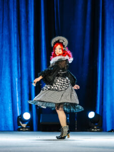 Saturday evening was the fashion show! I modeled for Sweet Mildred during this show so I wasn’t able to watch it, but I can share my experience as a model. There was a designated fitting room and masks were required in the fitting room. They provided masks for any models, makeup artists, and designers who did not bring one. The only time we took off our masks was to do makeup or to drink water. The fashion show started a little bit late, but once it started, everything ran smoothly! The first designer was Enchanted Dream Couture, and then Sweet Mildred was second. After all the designers finished their sets, the designers and models went back on stage for a final walk. Models were not required to stay for the final walk, so a lot of people left early to grab food or for other convention obligations. I didn’t have any plans post-fashion show so I stayed until the end!