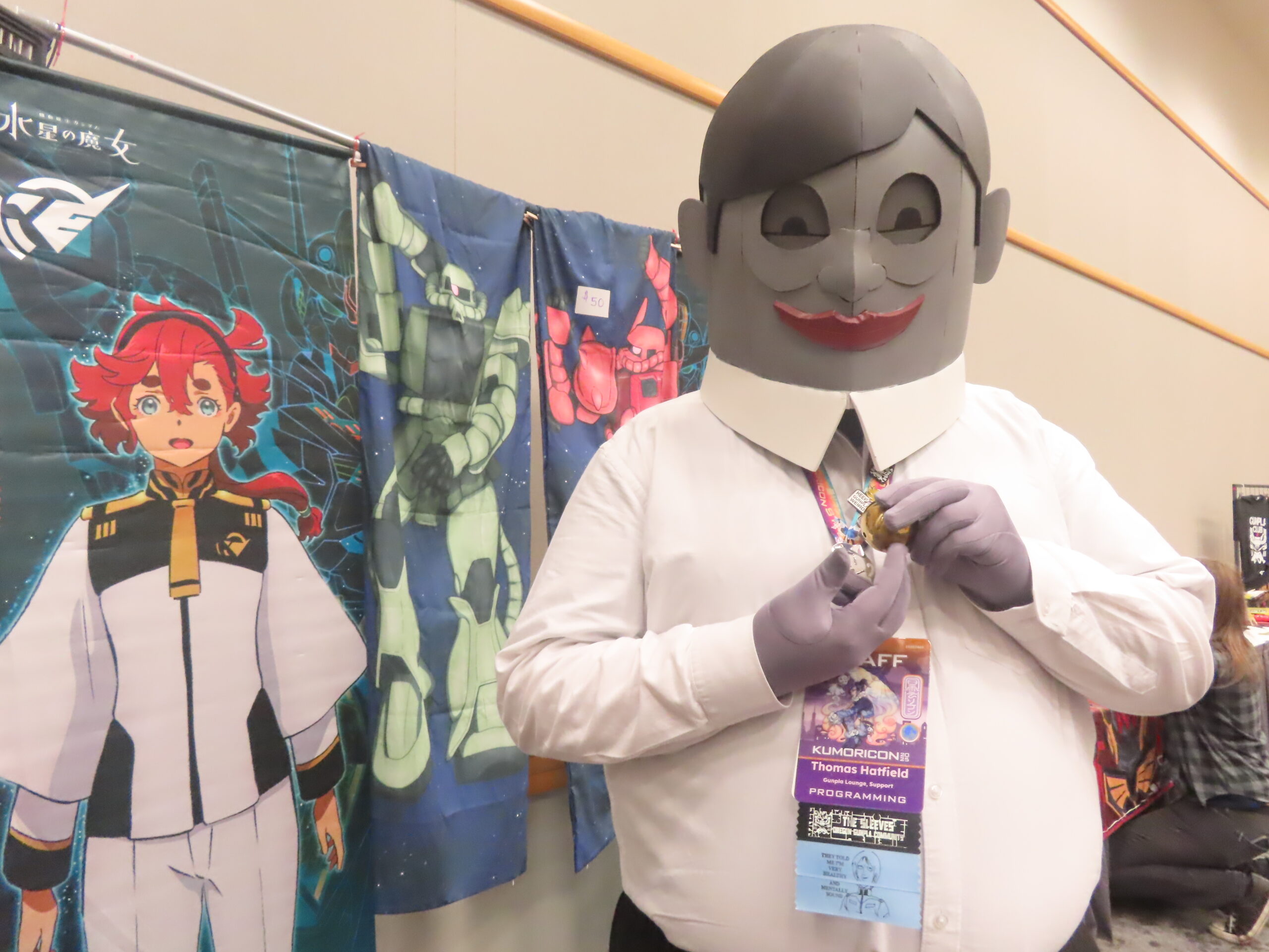 I went into Kumo Con without much expectations. Friday morning was light. I was able to check out a few rooms. I browsed through the Gunpla lounge where one can buy gunpla, trade Gundam ribbons, and get free packs of the Gundam TCG game. I appreciated that there was a vibrant Wow! Cool Robot! community in Portland. I also went to the karaoke room next door. A Jinu cosplayer sang, “Flesh for Fantasy.” The wait wasn’t too long, so I carried on with “Vanish into You” by Lady Gaga.