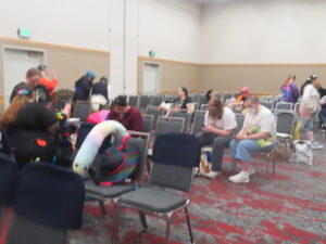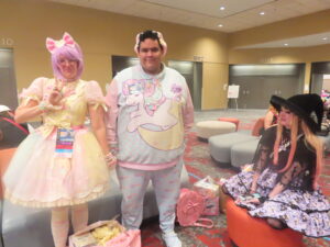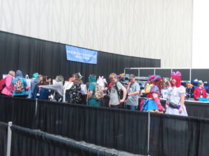 I checked in with registration. While there was a hiccup getting my press badge in, the staff was very friendly in handling it. I also appreciate that Kumo Con is one of the first cons in a while that I have attended that allows attendees to have a pronouns sticker on their badge. Sometimes badge ribbons make it hard to see, especially if you’re a collector of them. Kumo Con had no shortage of attendees collecting ribbons to decorate their badge. (wish I had known about this prior!)