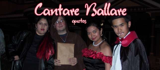 from Sakura Taisen." "My name's not Qui. I'm not French." "In our culture, it's not right to curse in the presence of a lady." "No BR? You suck!" ~what happens when you put a cat and rat in the same chat window "He's Cinderella!" ~Tom's cousins renaming Michael "Angie! Here's your chance to meet a person named Quoi!" "Hey! We're from the same anime! Let's take the spork pic!" ~Moo "Phantom of the Opera...should have brought my Christine...oh hell, I can stomach being Carlotta." "*Victoria cursing at her camera*" "Dancing Queen!" "It's the Wolfwood masscres beach people song!" "Petite Love?" "Yes yes!" "Sod off, I'm Jewish." ~ Tom trying to avoid cell phone marketers "Look! It's the men in black!" "We're agents!" "Dad can fix anything mechanical." "Eep...he wants to have 'the talk.'" "Yes I like pina coladas...let's get caught in the rain." "We had Matrix people just yesterday." "The restaurant I miss most is Victoria Station." "Me too!" ~Mr. Ton-that and Victoria reminiscing about food of yesteryear "The cow ate a cookie and had a good time." --> "Urge to destory the world rising." ~ from a cheesy telephone game at the birthday party "GO AWAY!" "Cakey! Cakey!" "That was a long neko nap!" "The party is on Filipino time...the guest of honor is late." "Victoria got a hole in one?!" "Don't pay attention to the golf score, I'm just randomly adding marks" "$40 is my limit on Indiana Jones" "So THAT's why I was so pissed off at the camera!" "There coulth beeth uh problem" ~Tom trying to talk with fangs "Forgot my camera....AGAIN!" "Hideo sucks! I like Kyoko better!" ~Tom playing Rival Schools "Bite me." "OKAY!" "'Dancing All Alone'...it's more of a breakup song." "But I thought it was about self service?" "Anything by E-Rotic is considered sexu." "You aren't video taping this, are you?" ~Albert playing Para Para "The Euroebeat King in his natural habitat" "Reni? Who's Reni?!" "You idiot! Hoshigumi! HOSHIGUMI!" *strangles Tom* "Save that for the bedroom" "Her face is turning the same color as her dress!" ~ Tom, Victoria, Holly, and Amanda "I love you...and I won't let anything stop us." |