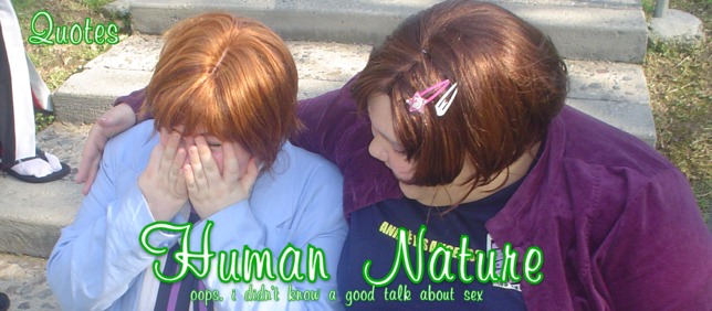"It must be some coming of age thing." "Their coming of age?" "I wish Justin was here. He'd tell them about the facts of life." - Tiffany "THERE'S A STORM COMING!!!" "BRING IT BITCH!" "I CAN HAVE A PENIS IF I WANTED TOO!" "Why don't you cry about it on your LJ, then?" "Thought Zach was your dad, Steph!" "Dear Diary, Mood Apathetic." "Our drama free con is no longer drama free." "FER is a diva. She's a cosplay diva." "I don't have time for this." "My Bun Bun secretly thinks of killing Tom - WITH KNIVES!" "And she's got nice boobies." "Well, I think the videographer is hot as she's about to flash her panties at me right now." - Tiffany "Tom's boobs have nothing on you, Vic." - Lacie "On the next episode of cosplay drama..." "And they were like making love and cuddling..." "Like flower petals falling her breasts..." - Tiffany "I was drunk and got mad." "You know, if any of your heels break, I am obligated to carry you." "I dare you." "I'm not drunk, really I'm not drunk!" "Stan is the best chocobo ever!" "You'll learn the art of pretend drunk when you're in college." "Wanna see my boobs?" - Carolyn "I like cats, cats are cute..." "Liking cats, now that's elitist!" "Happy 21st Birthday, Matt Matt!" "Vic, I'm turning 22..." "Let's not go to Camelot, it is a silly place." "I'm Aryan, I don't have a brain." "Nagger guy." "But I hear 'nigger' all the time on MTV, what's the big deal?" "I want to be hosted!" "Impromptu Kingdom Hearts gathering." "DON'T YOU KNOW MY TEARS WILL CAUSE AN INFERNO!???!!" "Suit up. NOW!" "Stan looks like a butler or something." "Oh yeah? How may I serve you this fine evening?" "Let it go, let it go!" "They're in Da Ho Club. They're whore people." "Fight the power, Tom. Fight the power, Tom." "You damn Cyberdyne dolls." "Actually Tom calls them Village of the Damned dolls." "Tom's tits are hot." - Lacie "It was a dark and stormy night. Carolyn, Stan's schoolgirl mistress, was in bed..." "Can I not be in this?" "Great, Vic is writing her het smutt again." "But I didn't break your heart." "Tomcat!" *glomp* "I missed you, I missed you, I missed you, I missed you, I missed you, I missed you, I missed you, I missed you!" Pictures are copyright by Victoria Erica. If I took your picture, feel free to use it on your site or cosplay gallery. If you want me to remove something, kindly email me. While you're here, do sign the guestbook. This site was brought to you by the font Muriel. |