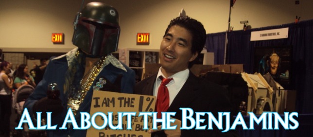 "Comic Zombie Parking over here!" "Miguel is a brony." "One of us, one of us!" "When you get down to it, Star Wars is wizards in space." "With this wig, I could go as Gwen Cooper. 'Could' being the operative." “It’s a pajama party! No really, I don’t know what I’m wearing today.” "Hey Stan. Are you cosplaying as the 1%?" "I am the 1%...the 1% of awesome." "STAN! Take my money, you are the 1%!" "1%! 1%! 1%!" "We're all in /co/splay." "I can show you where you can get the best TPB deals!" "Hi! I'm a voice actor!" "We have two ponies, a bat, a cat, and a spider." "And is spider is driving." "He has a heart as big as my boobs!" "I don't support a religion that lives in cosmopolitan luxary who sticks their nose into intergalatic politics." "Join the empire. Our ships are shaped like triangles!" "It's okay to cry, Stan. Crying takes the sad out of you." "That postal guy looks like the child molestors I know." "Gay for Captain Jack!" "Do the thing with your finger...that just sounds wrong." "Out of all things, this is THE WORST POSSIBLE THING EVER!" "This is Jared's face when he watched Lucky Star."