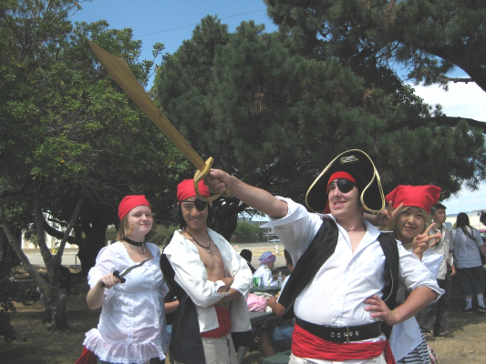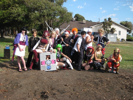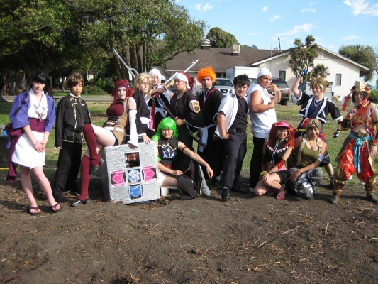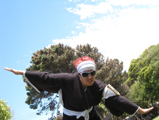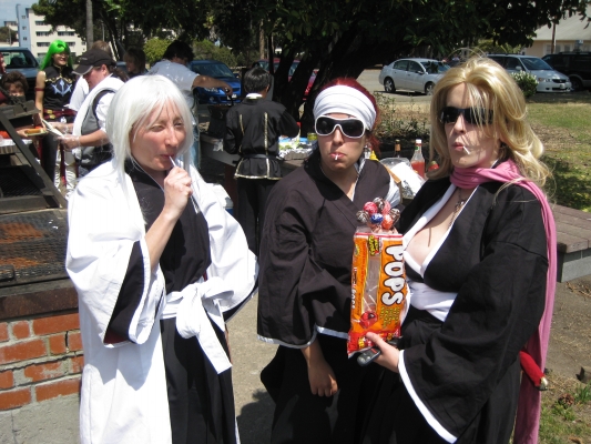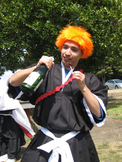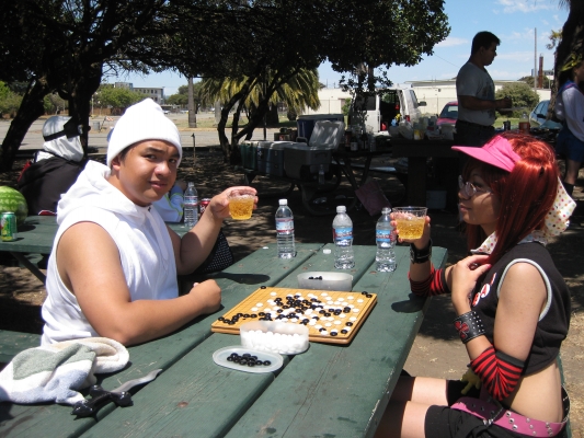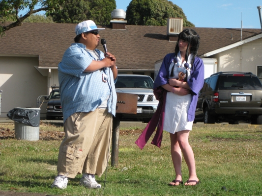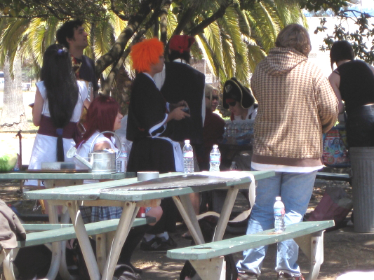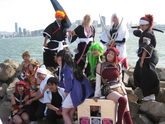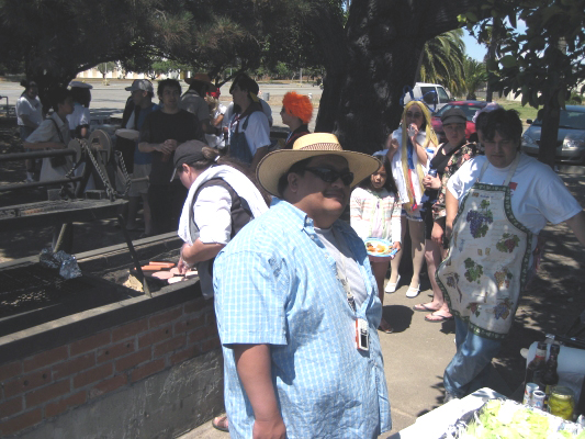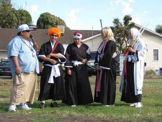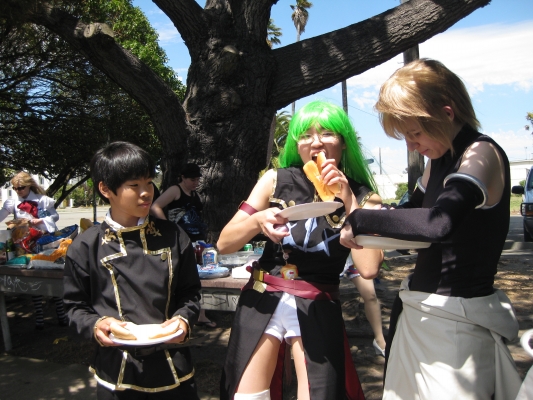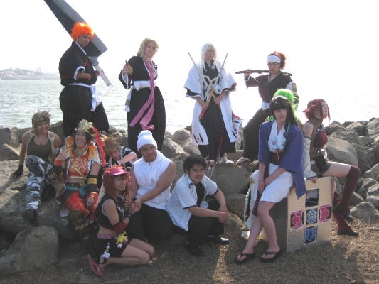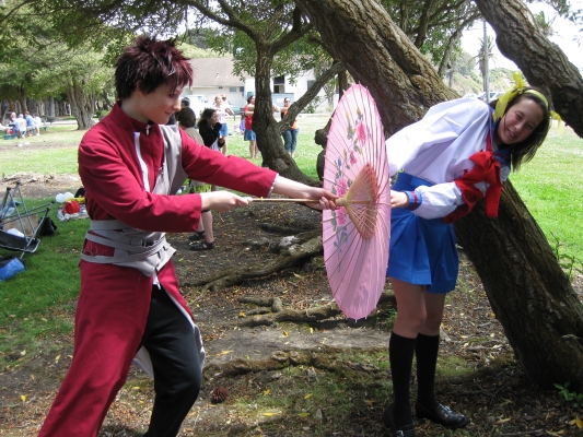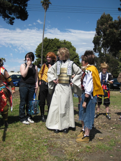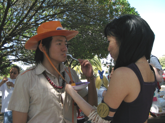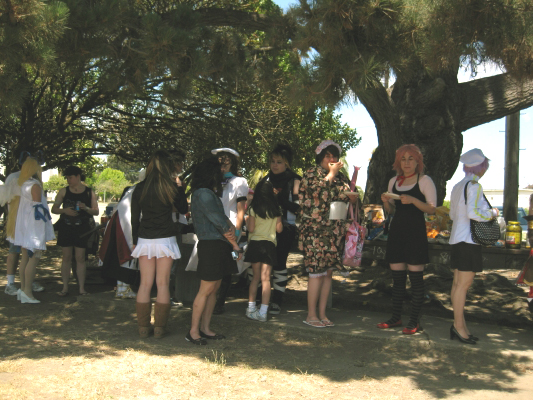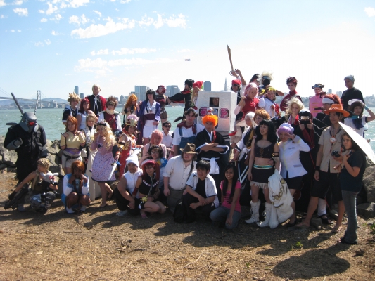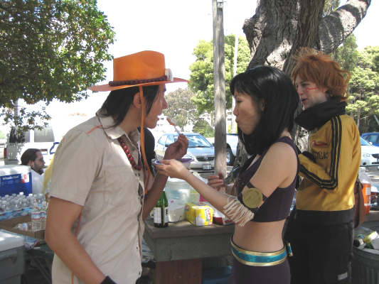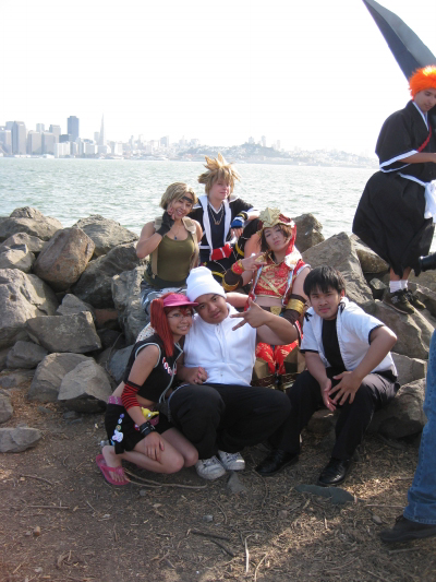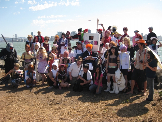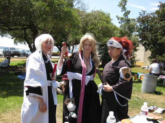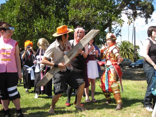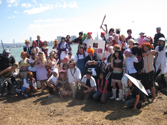 When fellow Bay Area cosplayer and press BART Boy announced his plans for a Nor-Cal Cosplay Picnic in March at Treasure Island, many looked forward to it. This was one of the first events of such caliber in Nor-Cal. The So-Cal Cosplay Picnics went so well over the few years. How would the Nor-Cal equivalent prevail? Then March rolled in. And so did bureaucratic red tape that canceled the picnic on its scheduled day. This was definitely not the first impression any event desired. But like a child who is thrown off his/her bike, BART Boy and the organizers brushed the dirt off their shins, cursed a little, and got back on their figurative bikes to bring the Nor-Cal Picnic in June. June 21, 2008 I woke up to my 9AM alarm promptly at 11AM. Cursing my late awakening, I scrambled for the quickest and most civilian-friendly costume best suited for the weather. Lupin? No time to style the hair. Sosuke Sagara? Quick, but guns are not civilian-friendly. Borat in his green swimsuit thong? Tempting but no. I reached in my closet and located the Yuki/Kyo summer uniform that Hitori made me years ago. I put it on and quickly noticed that my arms were getting too thick for the sleeves. Remind me to thank my now-expired gym membership and years of heavy lifting at my old job. To keep my pack light and avoid the risk of damage, I left the bracelet and cat ears behind. Due to increased gas prices and in observance of the minimum legal drinking age, I also left behind a case of seasonal product that my current job sells. If you're a baseball player who needs his bat, you ask for a bat boy. If you want to hear allegations of sexual misconduct by a priest, you ask an altar boy. If you want to find your way around the public transit in San Francisco, you ask BART Boy. Through foresight, BART Boy provided not only detailed driving directions to the Treasure Island picnic site, he provided detailed instructions for taking BART and MUNI to the Treasure Island picnic site. As frosting on the cake, he provided photos of landmarks and transit signs. Considering how all street signs and buses look the same, this was a great help. After a quick ride on BART (with an electrical problem delaying the train), I ran to the transit station and found a waiting Treasure Island bus. Though I only set foot on the corner of the island holding the picnic, I really liked the view of the mainland across the water and the bridge connecting the two. Upon departing the bus, I ran towards the picnic location. Some guy I passed by took one look at me and said, “Hey, I think your friends are that way. There's a bunch of people in costume.” I guess the “Fruits Basket” summer uniform is distinguishing enough to be spotted as a costume. Mr. Wendell the MC welcomed everyone and introduced BART Boy when he finally arrived after 2PM. I arrived at 1PM and found the picnic in swing. Cosplayers were chatting away with fellow cosplayers. A watermelon lay smashed; presumably by a bat. Manning one of the grills was Raider 3. You can't have a picnic potluck without a spread of food and drinks. Food was plentiful. Drinks were cold. One potluck item that I really enjoyed was Patrick's scotch eggs. Scotch eggs are hard boiled eggs wrapped in sausage, breaded, and deep fried. A handmade scotch egg counters the stereotype that British food sucks. I ate about three of them before growing concerned of cholesterol poisoning. Then I ate two more. I'll admit that the dozens of people who turned out for the Nor-Cal Cosplay Picnic was not as high as the hundreds who turned out for the So-Cal Cosplay Picnic. But in this case, less is more. It's akin to the issue of class sizes in university. Sure, having more seats in a class means being able to teach more students with the same professor. But good luck trying to get some quality time with that professor during office hours. With a smaller setting, I was able to spend better time with fellow attendees. Patrick noted it best when he observed that we were able to talk more during the first hour of the picnic than the entire Fanime weekend. So what can one do at a cosplay picnic located on Treasure Island? Well, it depends on what you feel like. If you're a pirate or have the skills of one, play Liar's Dice. Rico brought out the Go board. Pikmin Link was holding photoshoots by the shore for those interested. For those inclined, talking among friends and catching up on events was an option. Then there was the foolproof way to entertain yourself and others by acting the fool. I made my rounds meeting OniCourseMusha, Ryuhayabusadoa2, and the rest of Team Misaki. I then met Janelle, a new face I haven't recalled seeing at a con. Oh, well, these events make it a heck of a lot easier to meet and hopefully remember new people. And if it turns out that I got the name wrong, whoops. There's always the next con. As usual, the costumes were always a sight to see. The cool sea breeze began to gave way to heat. But the weather was still tolerable. Compared to the high heat in other parts of the Bay Area, today couldn't have been better. Once Old Man Mike arrived and set up a sound system and microphone, Wendell and BART Boy were able to grab our attention. BART Boy announced a treasure hunt game. Appropriate, considering that we were on Treasure Island. We divided into teams of four. Of note were Pirate team and Bleach team. After some very unconvincing alteration and augmentation, I fit in with Girl team with Janelle, Ten, and Panda. BART Boy provided clues numerically, regionally, and agriculturally. Naturally, I knew the answers to the clues but no clue putting them together. After heading off in the general direction and deviating, Pirate team began running back with the treasure. But odd controversies and misinterpretation of the rules (Of course, pirates WOULD screw up the rules), resulted in a rematch that resulted in Bleach team winning. Congratulations. Now for the group photo. Thank to BART Boy for wielding my 