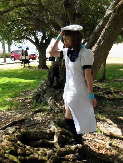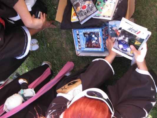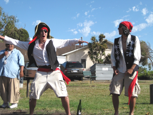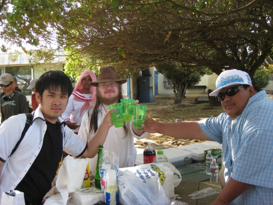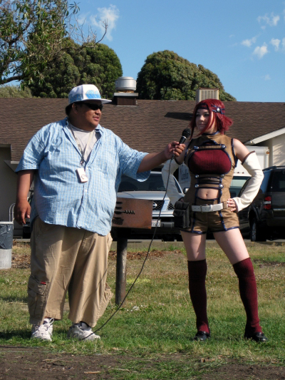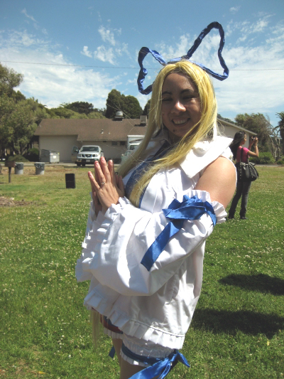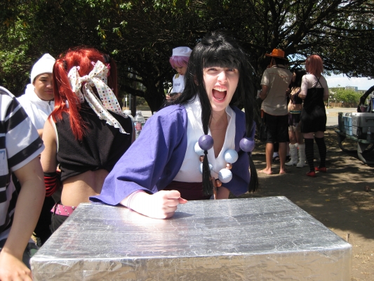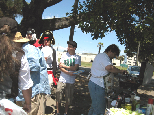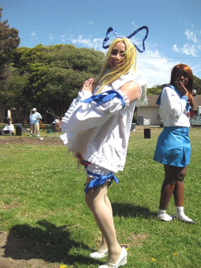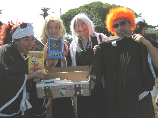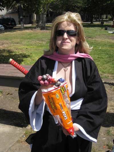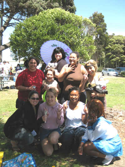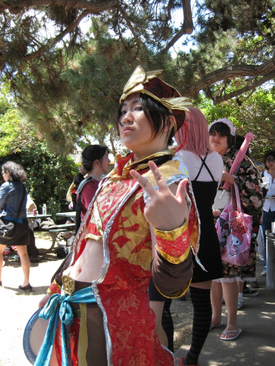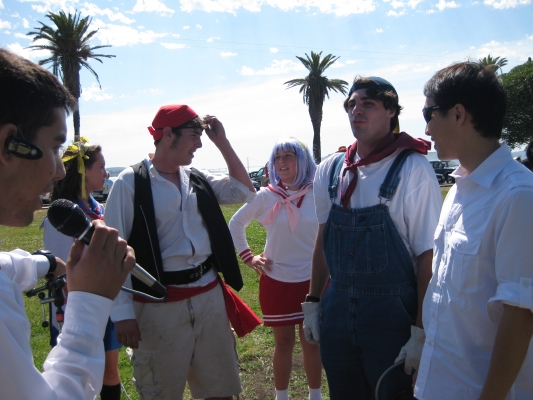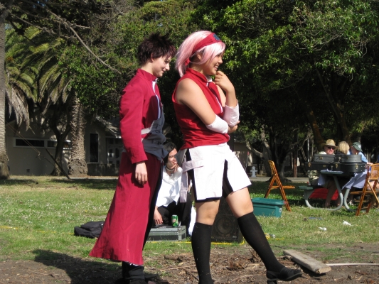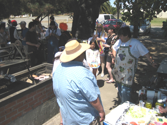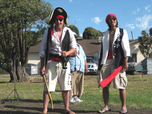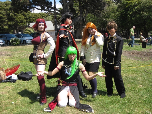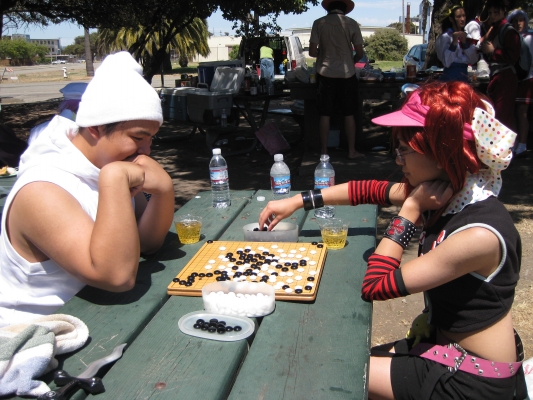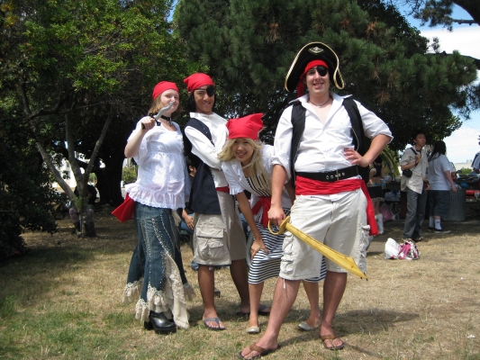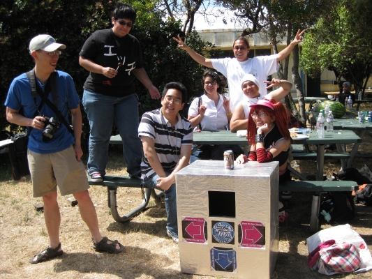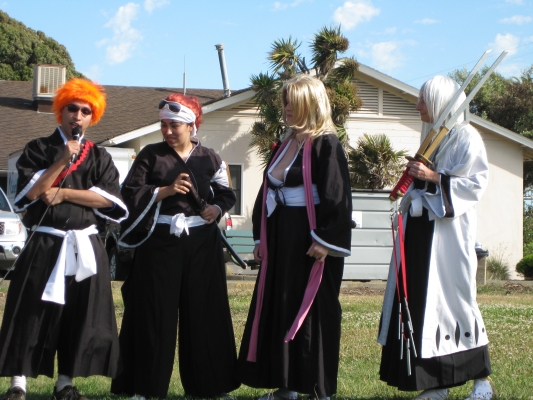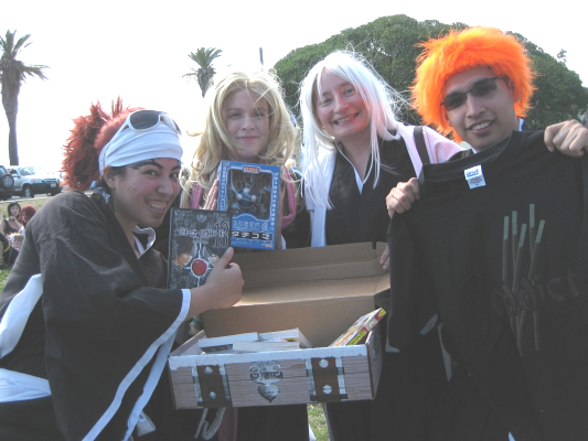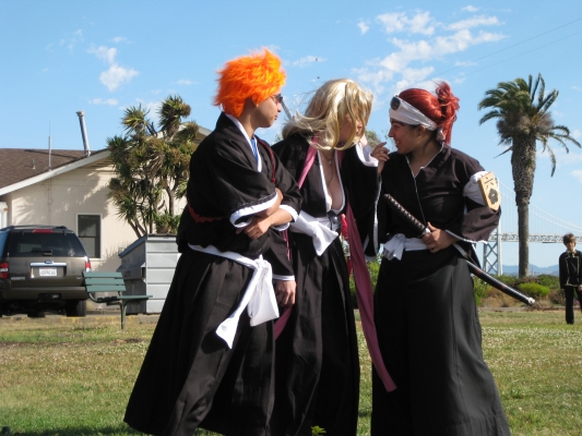 When fellow Bay Area cosplayer and press BART Boy announced his plans for a Nor-Cal Cosplay Picnic in March at Treasure Island, many looked forward to it. This was one of the first events of such caliber in Nor-Cal. The So-Cal Cosplay Picnics went so well over the few years. How would the Nor-Cal equivalent prevail? Then March rolled in. And so did bureaucratic red tape that canceled the picnic on its scheduled day. This was definitely not the first impression any event desired. But like a child who is thrown off his/her bike, BART Boy and the organizers brushed the dirt off their shins, cursed a little, and got back on their figurative bikes to bring the Nor-Cal Picnic in June. June 21, 2008 I woke up to my 9AM alarm promptly at 11AM. Cursing my late awakening, I scrambled for the quickest and most civilian-friendly costume best suited for the weather. Lupin? No time to style the hair. Sosuke Sagara? Quick, but guns are not civilian-friendly. Borat in his green swimsuit thong? Tempting but no. I reached in my closet and located the Yuki/Kyo summer uniform that Hitori made me years ago. I put it on and quickly noticed that my arms were getting too thick for the sleeves. Remind me to thank my now-expired gym membership and years of heavy lifting at my old job. To keep my pack light and avoid the risk of damage, I left the bracelet and cat ears behind. Due to increased gas prices and in observance of the minimum legal drinking age, I also left behind a case of seasonal product that my current job sells. If you're a baseball player who needs his bat, you ask for a bat boy. If you want to hear allegations of sexual misconduct by a priest, you ask an altar boy. If you want to find your way around the public transit in San Francisco, you ask BART Boy. Through foresight, BART Boy provided not only detailed driving directions to the Treasure Island picnic site, he provided detailed instructions for taking BART and MUNI to the Treasure Island picnic site. As frosting on the cake, he provided photos of landmarks and transit signs. Considering how all street signs and buses look the same, this was a great help. After a quick ride on BART (with an electrical problem delaying the train), I ran to the transit station and found a waiting Treasure Island bus. Though I only set foot on the corner of the island holding the picnic, I really liked the view of the mainland across the water and the bridge connecting the two. Upon departing the bus, I ran towards the picnic location. Some guy I passed by took one look at me and said, “Hey, I think your friends are that way. There's a bunch of people in costume.” I guess the “Fruits Basket” summer uniform is distinguishing enough to be spotted as a costume. Mr. Wendell the MC welcomed everyone and introduced BART Boy when he finally arrived after 2PM. I arrived at 1PM and found the picnic in swing. Cosplayers were chatting away with fellow cosplayers. A watermelon lay smashed; presumably by a bat. Manning one of the grills was Raider 3. You can't have a picnic potluck without a spread of food and drinks. Food was plentiful. Drinks were cold. One potluck item that I really enjoyed was Patrick's scotch eggs. Scotch eggs are hard boiled eggs wrapped in sausage, breaded, and deep fried. A handmade scotch egg counters the stereotype that British food sucks. I ate about three of them before growing concerned of cholesterol poisoning. Then I ate two more. I'll admit that the dozens of people who turned out for the Nor-Cal Cosplay Picnic was not as high as the hundreds who turned out for the So-Cal Cosplay Picnic. But in this case, less is more. It's akin to the issue of class sizes in university. Sure, having more seats in a class means being able to teach more students with the same professor. But good luck trying to get some quality time with that professor during office hours. With a smaller setting, I was able to spend better time with fellow attendees. Patrick noted it best when he observed that we were able to talk more during the first hour of the picnic than the entire Fanime weekend. So what can one do at a cosplay picnic located on Treasure Island? Well, it depends on what you feel like. If you're a pirate or have the skills of one, play Liar's Dice. Rico brought out the Go board. Pikmin Link was holding photoshoots by the shore for those interested. For those inclined, talking among friends and catching up on events was an option. Then there was the foolproof way to entertain yourself and others by acting the fool. I made my rounds meeting OniCourseMusha, Ryuhayabusadoa2, and the rest of Team Misaki. I then met Janelle, a new face I haven't recalled seeing at a con. Oh, well, these events make it a heck of a lot easier to meet and hopefully remember new people. And if it turns out that I got the name wrong, whoops. There's always the next con. As usual, the costumes were always a sight to see. The cool sea breeze began to gave way to heat. But the weather was still tolerable. Compared to the high heat in other parts of the Bay Area, today couldn't have been better. Once Old Man Mike arrived and set up a sound system and microphone, Wendell and BART Boy were able to grab our attention. BART Boy announced a treasure hunt game. Appropriate, considering that we were on Treasure Island. We divided into teams of four. Of note were Pirate team and Bleach team. After some very unconvincing alteration and augmentation, I fit in with Girl team with Janelle, Ten, and Panda. BART Boy provided clues numerically, regionally, and agriculturally. Naturally, I knew the answers to the clues but no clue putting them together. After heading off in the general direction and deviating, Pirate team began running back with the treasure. But odd controversies and misinterpretation of the rules (Of course, pirates WOULD screw up the rules), resulted in a rematch that resulted in Bleach team winning. Congratulations. Now for the group photo. Thank to BART Boy for wielding my 