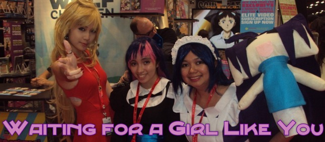 American Cosplay Paradise was seeking out iDolm@ster cosplayers to help out at the Funimation booth at New York Comic Con. I was one of the few to be selected. I brought four Azusa Miura outfits. I didn't think anyone would recognize the big sister type idol, but I brought the Miura-san puppet for to entertain a wider audience of fan. If only it were easy to teleport from Boston to New York in an instant like Miura-san. The Bolt bus ride was fairly smooth and got us there a little before 1PM. The convention haven't even opened up. I left my bags at the New Yorker Hotel and then proceeded to my favorite hole in the wall cafe for lunch. Already, you can see industry professionals and artists revving up for the big weekend. I wandered around the familiar Javits Convention Center. The layout was similiar from last year's - the Block on the South Side and Artist Alley on the North Side, panel rooms downstairs and dealers hall upstairs. Already 2PM, there already was a line to get into the dealers hall. Cosplayers were perfecting themselves in the noxious convention center bathrooms. There was a cosplay changing room, but no one knew how to get in.