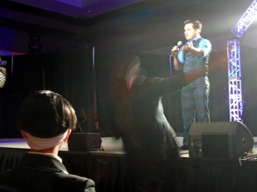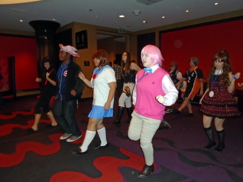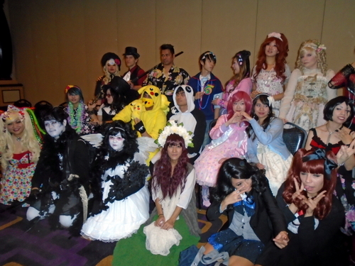 As a part time member of the Las Vegas Lolita community, I went to the fashion show immediately after cosplay lip sync to show support. I had no idea what to expect. I figure this would be locals showing off original work. However, this was a cornucopia of J-fashion and more. What I liked about the fashion show is that it had a diverse array of Japanese street fashion and it was explained in depth as the models were going up and down the makeshift runway. Lolita was showcased, but they also had other styles such as Kogal, Ganguro, Kigurumi, Decora, Mori, Otome, and others. I liked it was not just girly girls in Lolita frills who were participating in the fashion show, but gents also rocked a kigurumi and various styles of visual kei. Following the fashion show was a group photo. There were about 30 or so participants in the Japanese street fashion show.