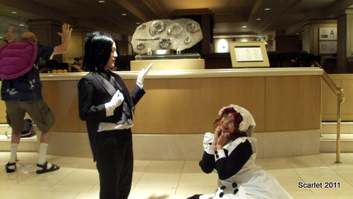 The weekend was coming down to a close. The team decided to end the weekened by dressing up as Black Butler characters. Check out ran smooth without any hassels. Sunday still had plenty of events going down from voice actors, autographs, dolls, last minute sales, stick fighting, and food trucks. Before we started out the day, the Cosplay Fest green room had a costume repair station available. Victoria had a few frays from her Maylene cosplay that had to be fixed up. Not only they were able to provide a pair of scissors, they also had a fray check adhesive to prevent further frays along the hem. This repair station not only takes take of mishaps, but also provides extra care in preventing further damage. No Need for Nostalgia: The Ladies of Tenchi Muyo by Jeff Before the panel started, I ran into the cast while at press registration going over the press panels and after that proceeded to over to the panel room which had a larger than expected turnout. Tenchi is just one of those shows I didn’t expect to be so big 15 years later, but surprise surprise, the turnout despite making the room standing only was amazing. It just goes to show how much of an impact Tenchi has had on anime fans back when it aired on Cartoon Network. The panel went off without a hitch despite the crowding and surprisingly enough the first question asked by Cristina Vee was about said impact on the fans which the actors were in shock and awe that so many people came out just for them. That really set the tone for the rest of them panel as stories from the booth were told, favorite moments from the series were recalled and stories about how they got into voice acting were told. It was an interesting panel however it was cut short by 15 minutes and ended early so the actors could begin their autograph signing which had an equally long line. Overall it was a fun panel and as a pleasant surprise it wasn’t plagued by the same questions voice actor fans constantly ask, my gripe with this was why they couldn’t hold it in main events or just a bigger room period, the overcrowding got to the point where it could’ve been a fire hazard and I felt really claustrophobic the entire time standing up. Hopefully next time PMX decides to reunite actors from a classic anime they take into account how the turnout for the event might be. Small Voices, Big Dreams: Cristina Vee by Jeff Once Tenchi ended the room cleared out and was no longer overflowing and thus Cristina Vee’s panel began. While most of the audience left the Tenchi panel for the autograph session this didn’t bring the panel down as Cristina spoke about what she’s been up to for the last few months. This included titles she’s been working on such as Squid Girl, K-On, Dynasty Warriors 7, BlazBlue and several others such as voice directing the new indie fighting game Skullgirls, but she also mentioned being in several shows she couldn’t talk about.. Because of the small audience, you had the luxury of not hearing the same generic questions from fanboys. Most of the questions were geared towards: how to break into voice acting, dream roles, the occasional line request, and cosplay plans. The panel ended on a sweet note when one fan from the audience gave Cristina a handmade cake with cream cheese frosting and strawberries. We all agreed that it took the cake for most unusual gift given to her at a con. Still in Love with Tenchi by Jeff Once Cristina Vee’s panel ended I rushed over to the Press room for the press version of the Tenchi Muyo reunion because I knew in a press setting the room wouldn’t be filled up to the point of standing room only and the setting would be more intimate between the actors and audience. This was my first time doing a press style panel and honestly I found it more enjoyable than the public version. Although only 3/4th’s of the cast showed up for the press version we still got a lot of great stories from their days working on the show and other stories from the booth which are always interesting to hear. In the end, they admitted how thankful they were that Tenchi still had quite the following almost 15 years later and proceeded to greet us by posing for pictures and talking with us. As someone who grew up with Tenchi on Toonami back in the day being reunited with my childhood was nothing short of magical and seeing the women behind those characters brought a huge smile to my face.