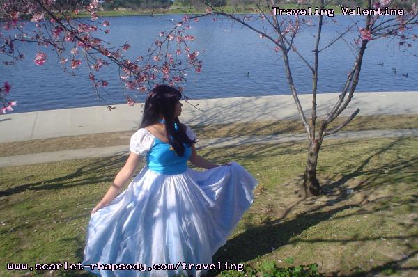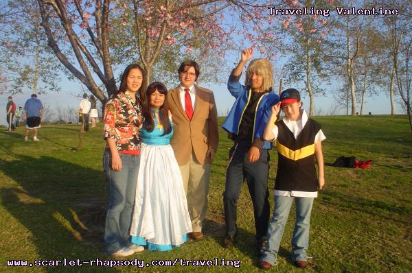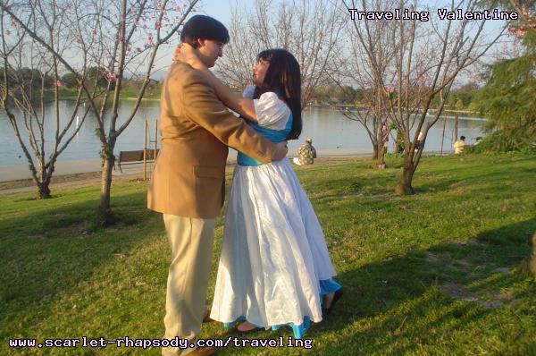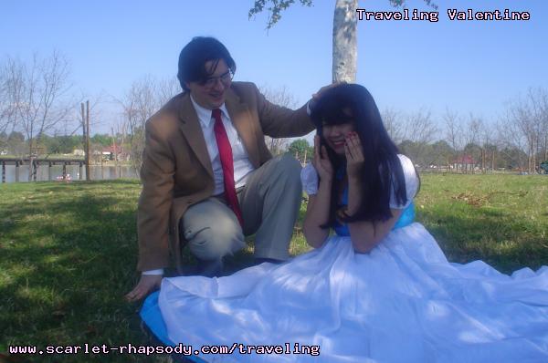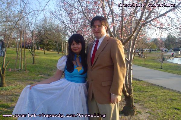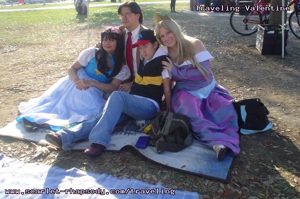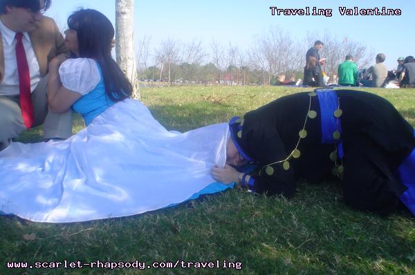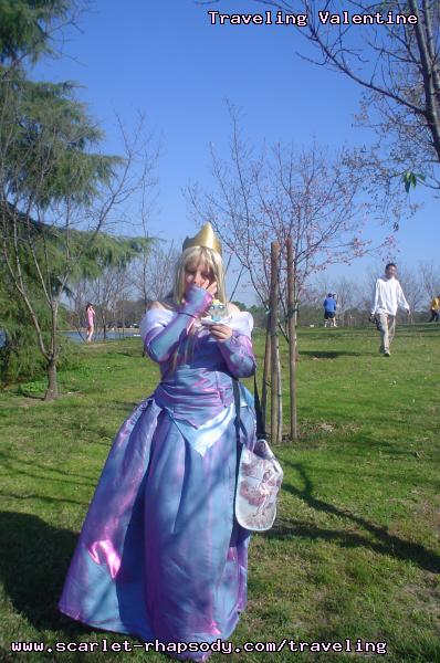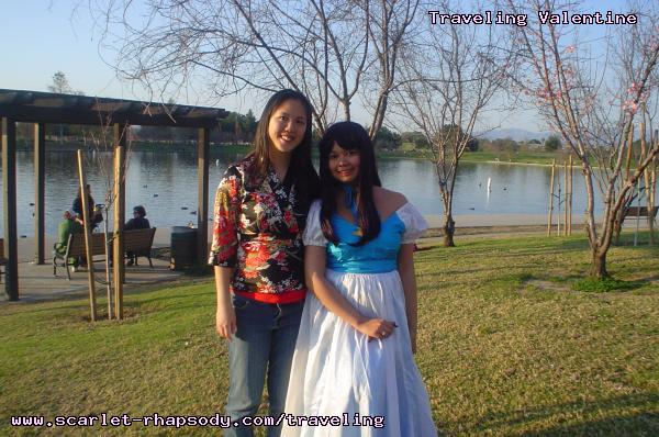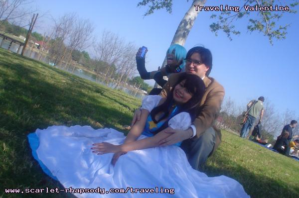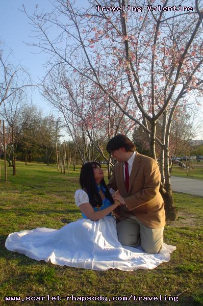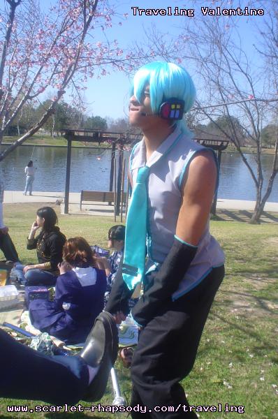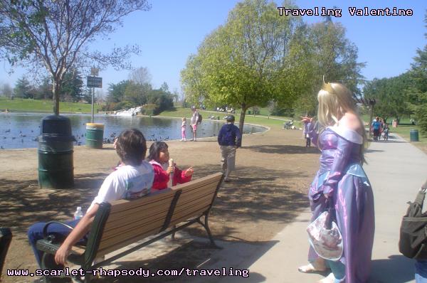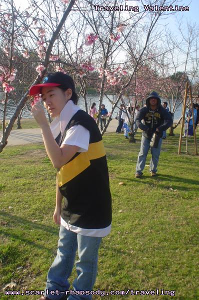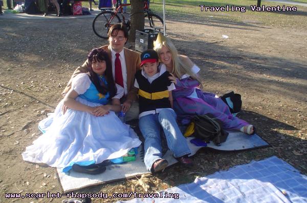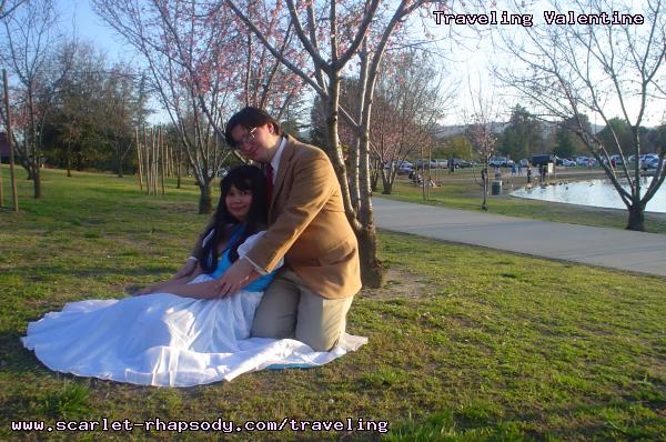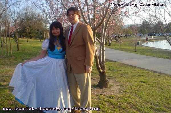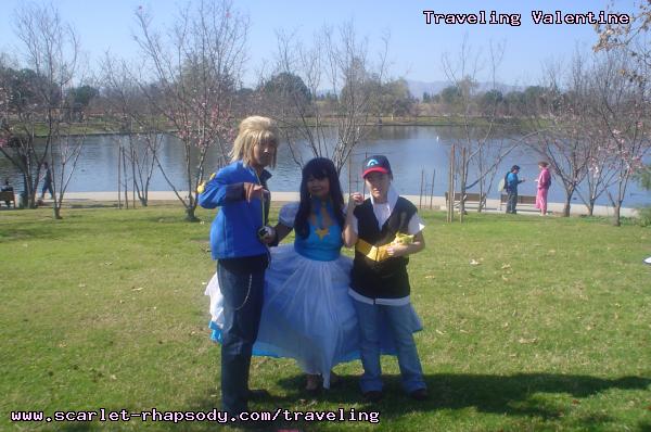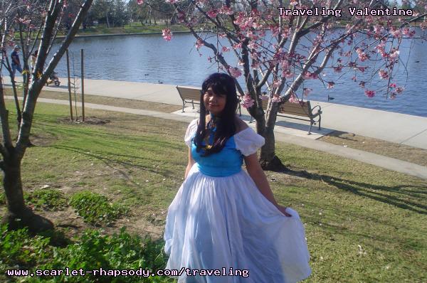| Curtain up! Light the lights! Nothing to hit but the sunny and decadent San Fernando Valley. Per usual, Stan, the official Traveling Valentine chauffer took the crew up to Sakura Watch at Anthony C. Beilenson Park. The organizers worried that the rain earlier in the week would damage any chance of the bloom. However, we had a slight improvement from the previous week. We hit some traffic on the 405 North, but this is Los Angeles, what else is new? We finally arrived at Lake Balboa at 1PM. Unfortunately, we did not where the designated meeting point was. We parked on the “waterfall side” of the lake. There were no cosplayers in sight. However, Carolyn and I ran into a few little girls who greeted us with a, "Hi Sleeping Beauty and Hi Snow White!" That was cute. We ran into Kenji, who was also looking for everyone else. After sending the usual “Where the hell are you?” phone calls, we found out that everyone was on the other side of the lake on the “playground side.” There was a nice picnic set up with tents and food. It was very nice of Jason and his crew to have this set up earlier in the day. I gave Julia her birthday present. She was turning 18, therefore Julia finally can graduate from minor-dom. Sorry, Carolyn. I gave Julia her present in a Frederick’s of Hollywood bag. (I didn't have any spare wrapping paper.) Everyone was quite suspicious of what she could get for her 18th. In the end, she discovered the Victoria Secrets beauty set I got her. On the lakeside area by the playground, we also ran into Mr. Postman and few of his Lolita friends. Unaware of the Sakura Watch gathering, Mr. Postman and his crew decided on an impromptu gathering the night before. It was a pleasant surprise seeing the Dollfie Dream pimp and a few Asian Ball Joint Dolls present at the lake. Too bad I left Cosette and Eponine in the car. Of course, Sakura Watch is all about the photo shoots. Though the cherry blossom trees were not like the ones you would find in a shoujo anime, we made the best for what he had available to us. The trees were not dead, but everyone who showed up in costume still had a chance to get some nice background for their cosplays. Originally, I was supposed to also wear Karen Kasumi from X/1999, but the X/1999 photo shoot had to be delayed for another week. I opted to cosplay as Nadeshiko Kinomoto from Card Captor Sakura because I heard Julia was going to cosplay as Sakura. However, he plans fell through. The story behind Nadeshiko is I cosplayed her because I was cast as her in a fandub project based on “The Flower” episode. Though I had the costume since 2002, I always had a Touya, a Sakura, and a Tomoyo. Yet, never a Fujitaka. Jared decided to cosplay as my teacher-husband for the shoot that day. Julia was very nice to do a photo shoot of the two of us. Thanks to Carolyn for taking pictures with my camera. (Though Julia suggests that everyone should pitch in to get Victoria a new camera since I had to downgrade to my older digicam since my other camera was stolen at Disneyland) In Julia's own words, "I'd ship it." Technically, I did have a Touya at the shoot. Caitlin was cosplaying as a Tsubassa variant of Touya Kinomoto. Here’s a shot of Touya trying to get in mah belly. Now all we need is the Sakura to get the full family portrait... Deb cosplayed as Ash from Pokemon: Diamond and Pearl. Stan also cosplayed as Volkner from the same series. Caroyln cosplayed as Princess Aurora from Disney's Sleeping Beauty. If you take a closer look at her fabric, you will notice that the color shifts from blue to pink, just like in the movie. Carolyn found this fabric for under $3 a yard at the Los Angeles fashion district. Even while taking glamour shots of the famed Disney princess, a few little girls continued to greet her. And here's Kate as Fuu from Samurai Champloo encouraging Traveling Valentine readers to drink Aloe Vera, the unofficial drink of Sakura Watch 2009. Jared and I took a few single shots of our Card Captor Sakura costumes. The funny part is, Jared will be pratically wearing the same suit for the X/1999 gathering the following week. A few people mistook him for Light from Death Note. I joked around that I should do the schoolgirl version of Nadeshiko to make this December-May pairing look more wrong than it should. As long as Jared does not make a Nadeshiko and Fujitaka amv to The Police's "Don't Stand So Close to Me," things will be fine. Carolyn discovered one of the joys of the park - the ice cream man! There was an ice cream truck parked right by our designated picnic area. Because of Carolyn's affinity for Power Puff Girls (and all things Cartoon Network), she was eating a Bubbles on a stick. "Are you eating Tiffany?" I asked. Our mutual friend, Tiffany, cosplays as Bubbles. Feeling tired from the San Fernando Valley sun, we decided to rest up in the picnic area. Stan gave us Girl Scout Thin Mint cookies. I took a few riceballs for sustenance. Carolyn and Deb were cuddling up because Carolyn needed a proxy boyfriend for the rest of the day. At this point, it was rest and relaxation and just random chit chatting among friends. To my surprise, The Hooded Man (aka the guy formerly known as Rey Rey), showed up to the gathering. The nice part about this gathering is that everyone was well behaved and there were no "Ramune Babies" present to whack innocent bystanders with yaoi paddles or to quote the latest Internet meme. Rey Rey, Angela, Jared, Carolyn, Deb, Stan, and I talked about the good old days and how much this gathering reminded us about the time when our fandom was not infected with the "Ramune Babies." Considering our first anime events were in the late 90's / early 2000's, maybe we're just looking at things from a much more grown up perspective. Maybe. Dusk was approaching. Angela pointed out that no one was using the "popular" trees for photos, so we decided to take advantage of getting last minute photos before leaving. The 5PM hour was a perfec