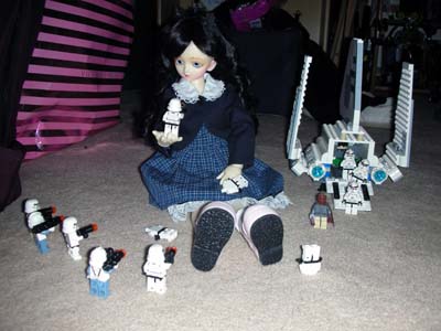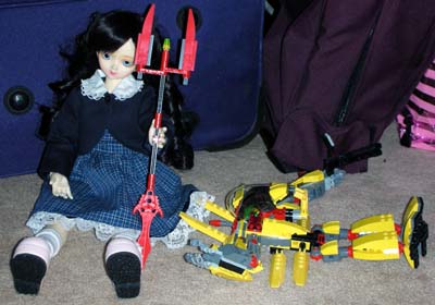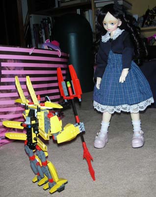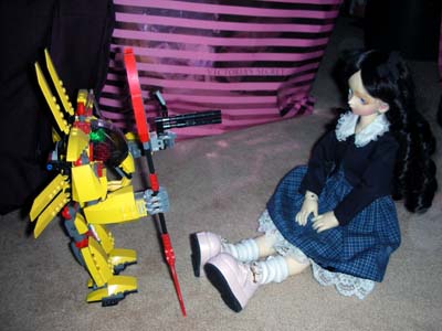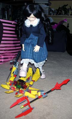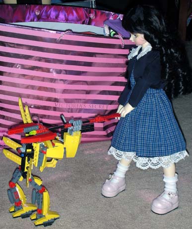 Mace Windu returned to the hot zone with reinforcements and with their combined firepower, they managed to cause absolutely no damage against the 43cm Village of the Damned Child. The battle was clearly one-sided as Cosette confused the troopers' laser blasts for flashlights. Not even Mace Windu's lightsaber had an effect. Acknowledging their ineffectiveness, the troopers routed from the battle. HQ decided to dispatch something bigger and newer in Cosette's direction. When Tom learned of the threat of the Village of the Damned children and their plans to occupy all the homes of people in the world via carriers and kill those immune to their charms, he contracted the Local Experimental Gear Originators (LEGO) Corporation to build something that could combat the VotD children. LEGO responded by developing the BYM (Big Yellow Mech) bipedal machine. Armed with a hand cannon, a spear, and missles, the BYM designed to stand and fight on equal footing against the VotD children. It was piloted with the obligatory anime male pilot. HQ briefed the pilot and launched him and the BYM to Cosette's location. Originally intended for use against Eponine, the BYM would have its first test run against the younger and smaller Cosette. "Heh heh," giggled Cosette, "Tom's room has more friends for me to play with." She stood up and LEGO discovered a minor flaw in their BYM design.
