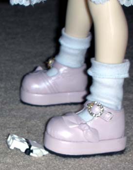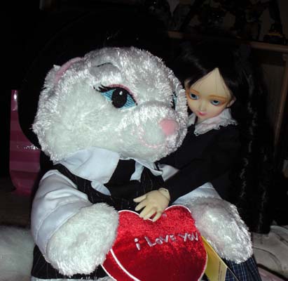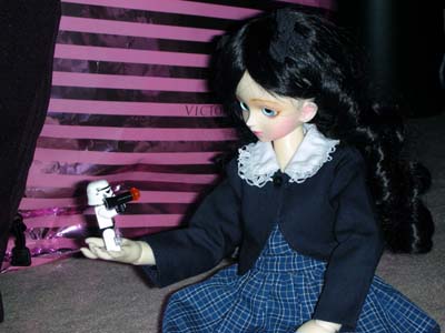 "Oh, I know this game," Cosette said, "Eponine and I play 'Poke the Tom' all the time when he's asleep." The BYM continued its lunging attacks and Cosette, while unharmed, was getting really annoyed. "Quit poking me," requested Cosette. "Why not pick on someone your own size?" But the BYM would not disengage its attack. After the 50th poke, Cosette asked the BYM, "I wanna play something else now." Before the BYM could answer, Cosette began her new game. "This game is called 'Stomp,'" Cosette said, as she performed the action associated with the name of the game. "I learned this game from watching Tom and Victoria jump on that dancing pad game." The BYM toppled backwards. Unable to regain balance, it was as helpless as a turtle on its shell. It desperately fired a few more rounds of its hand cannon before running out of power. Victorious, Cosette examined the downed mech for salvage before taking a rest. "I have a spear for now," Cosette proclaimed. Then she remembered that she was on her way to Tom's gun collection to pick up something for Eponine. So she pocketed the spear (ouch) and walked towards the closet. But there was one last obstacle in Cosette's path. Unlike the other obstacles, this new distraction succeeded in halting Cosette's movements. "Cat!" purred Cosette as she glomped a nearby plush cat that happened to be sitting in Tom's room. Whether by coincidence or through intended placement, Cosette's innate adoration of the feline kind stopped her dead in her tracks. The next morning, Tom and Victoria found Cosette hugging that cat for who knows how many hours. Quietly and quickly, Tom stuffed Cosette in Victoria's bag and handed her to Victoria. VotD child and its carrier flew down to so-Cal and their home. Their departures made Tom sad (Victoria) and relieved (Cosette) at the same time. He escaped another encounter with the VotD, but next time he might not be so lucky when he visits Victoria in so-Cal. Will he be able to survive dealing with the combined powers of Cosette AND Eponine? Pictures are copyright by Victoria Erica. If I took your picture, feel free to use it on your site or cosplay gallery. If you want me to remove something, kindly email me. While you're here, do sign the guestbook. This site was brought to you by the font Daisy Script. |