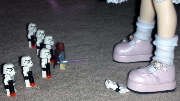 The troopers took up defensive positions while Jedi Master Mace Windu fled to call in reinforcements. Cosette spotted the people beneath her and squealed, "CUTE!" She picked up troopers one at a time to examine them. After dropping a few, she finally was able to talk to one.