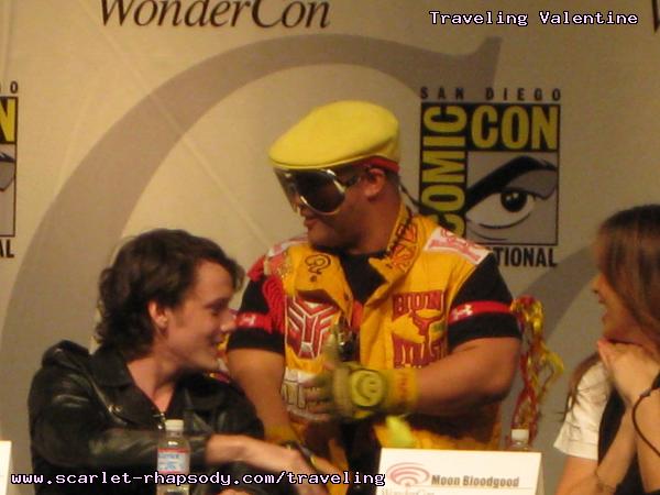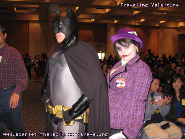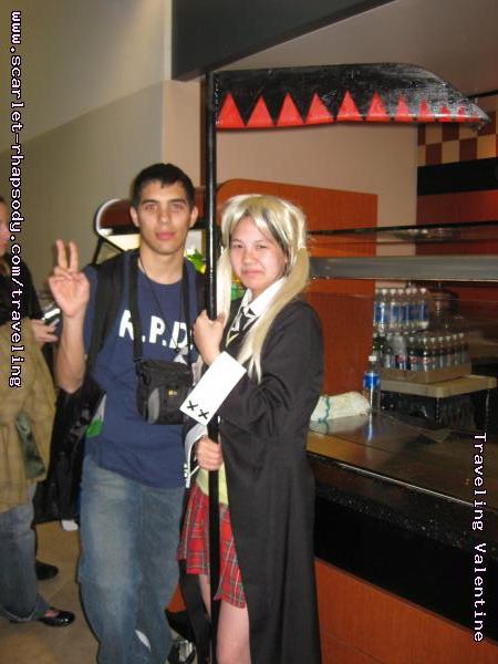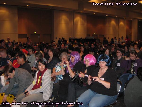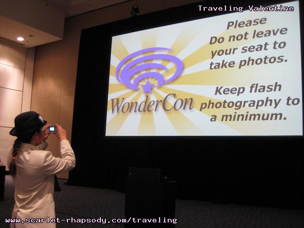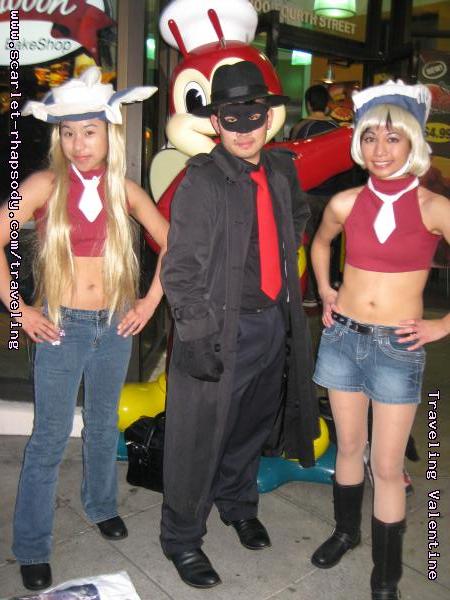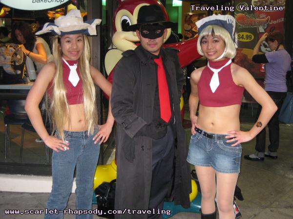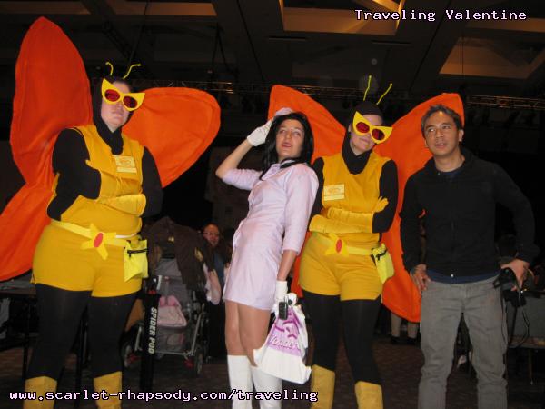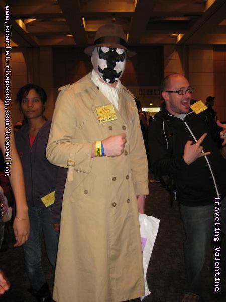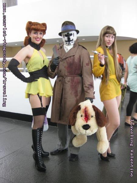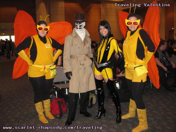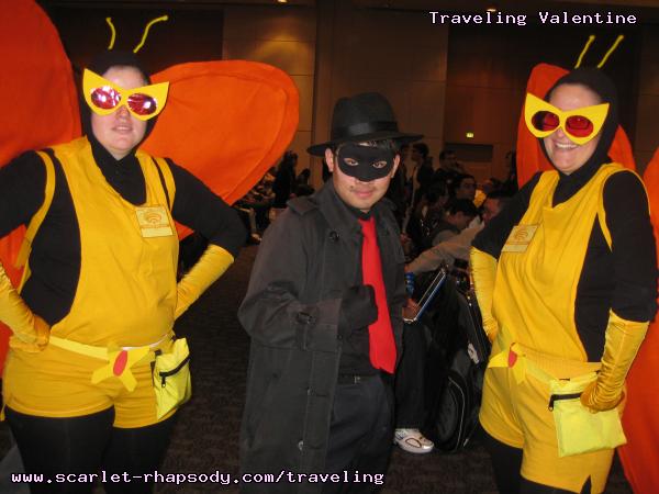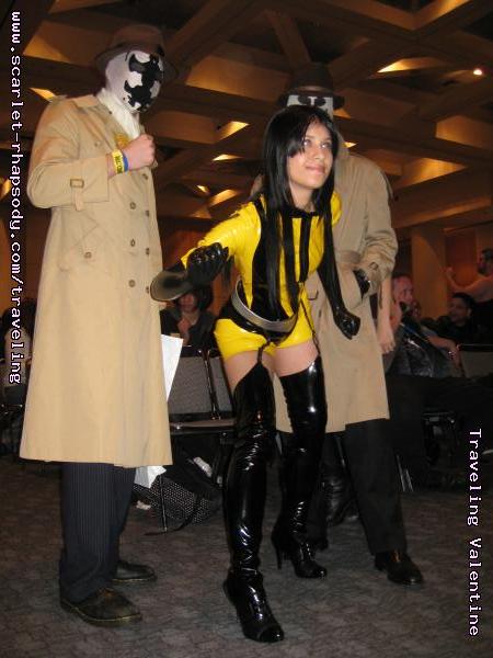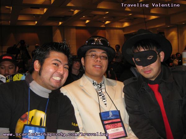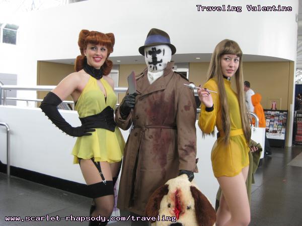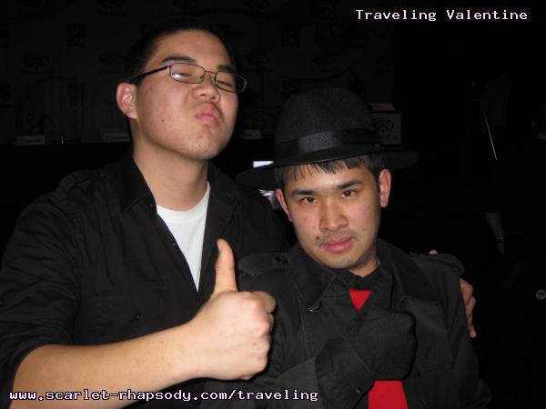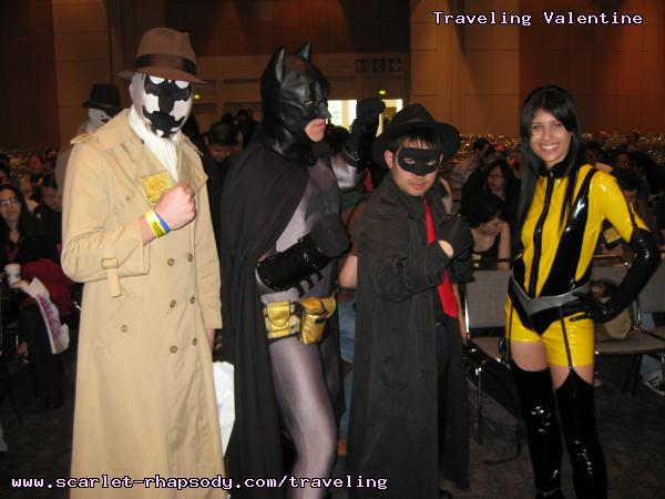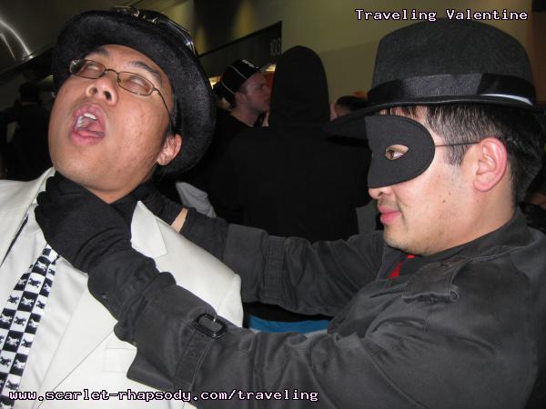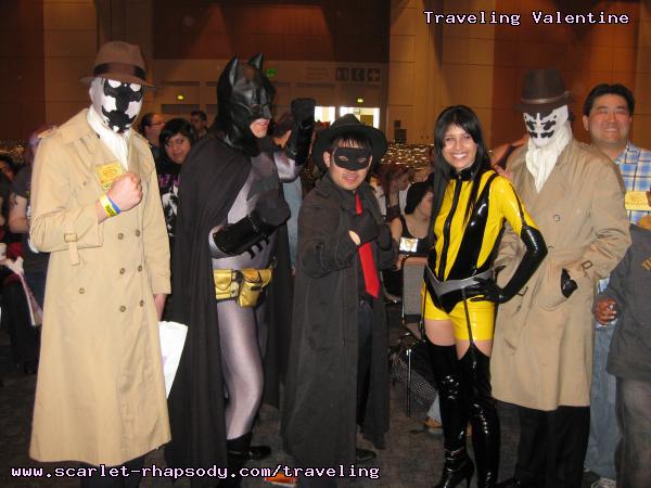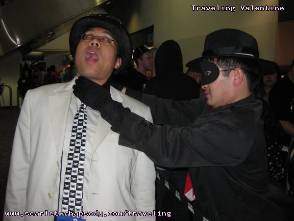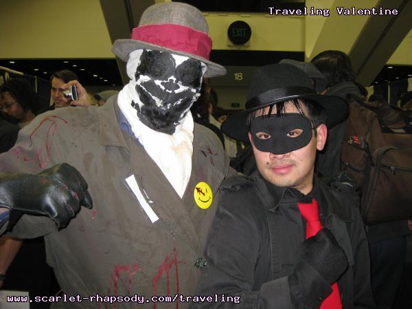 | You may find yourself awake at 7AM on a Saturday. You may find yourself dressed as a comic book character from a movie you never finished because you left the theater in the middle of it. You may find yourself half asleep inside a BART train. You may find yourself getting stared at by passengers because of your black suit, black trenchcoat, red tie, stylish black hat, and black mask you're wearing. You may find yourself walking to the Moscone Center. You may find yourself standing in line for two hours for a panel. You may find yourself getting asked to have your picture taken. You may ask yourself, "My God, are we inside yet?" Letting the minutes go by, as the attendees trickle into the Esplanade Ballroom. Letting the photographers shoot pictures, as the costumed heroes pose. Into the seats we go, as the "Watchmen" panel begins. Once in a lifetime, you see the costumed heroes without their masks. You may find yourself noticing blood on an exit sign. You may find yourself reading the WonderCon rules and requests. You may find yourself staring at the spacious stage where the panelists will speak. You may find yourself performing an epic fail. The "Watchmen" panelists praise their film. Same as it ever was. Same as it ever was. Same as it ever was.* Click here for the "Watchmen" panel synopsis. You may find yourself admiring the zoom on your camera. You may find yourself leading a damned dirty ape to the Masquerade registration. You find yourself being taken by your hand through mobs of people. You may find yourself with a new "Watchmen" Comedian pin. Watching exclusive sneak peeks of "Astroboy." Watching Nicholas Cage develop a third facial expression. Watching cheesy B sci-fi movies remade into cheesy B sci-fi movies with current technology. Once in a lifetime, you're watching these sneak peeks before anyone else. Back at the Dealers Hall, where there is plenty to see. And the goods cost plenty of coin. Mark Hamill's autograph goes for $100. But the second is only $90. Ryo-ohki's only costs $10. So there's money for her, and a memory for me. You may find yourself easily recognized despite wearing a mask over your face. You may find yourself running back to the Esplanade Ballroom. You may find yourself suddenly interested in this summer's "Star Trek" film. You may find yourself answering a quick question from TiVo's "BaDoop BaDoop Show." You may find yourself too tired to fight the lines to "Star Trek." You may find yourself back outside waiting in line to enter the Esplanade Ballroom. You find yourself thinking the line is worse than Disneyland. You may find yourself relieved to finally enter the room. You may find yourself listening to Elijah Wood answering yet another question related to the "Lord of the Rings." You may find yourself thinking his new animated film "9" reminds you of a little big PS3 game. The team behind Pixar's "Up" praise their film. Same as it ever was. Same as it ever was. Same as it ever was.* Click here for the "Up" preview synopsis. The "Terminator Salvation" panelists praise their film. Same as it ever was. Same as it ever was. Same as it ever was.* Click here for the "Terminator Salvation" panel synopsis. Letting some frustration out with old-fashioned violence. Letting the sharp dressed suits get some shots of themselves. Meeting some good old friends, if only in passing. This sort of stuff does not happen once in a lifetime. You may find yourself hungry after 10 hours without food. You may find yourself dining with a pair of cute twins who cannot be any more asymmetrical. you may find yourself introduced to their friends Dennis and Rose. You may find yourself thinking the guy who approves the food at Jollibee is in dire need of functioning taste buds. You may find yourself satisfied that at least the Jollibee food provides the calories to keep you going. You may find yourself reviewing your EMT training and experience in field diagnosis. You may ask yourself, "Am I finally done writing this convention report section in bizarre new wave prose?" *Who takes a break from their busy schedule to come to a con and say their upcoming project is crap? Of course they're going to praise their work! Pictures are copyright by Traveling Valentine. If we took your picture, feel free to use it on your site or cosplay gallery. While you're here, do sign the guestbook. This site was brought to you by a font of some sort. Many thanks to Chaz Boston Baden for the image resizing and watermarking program. |